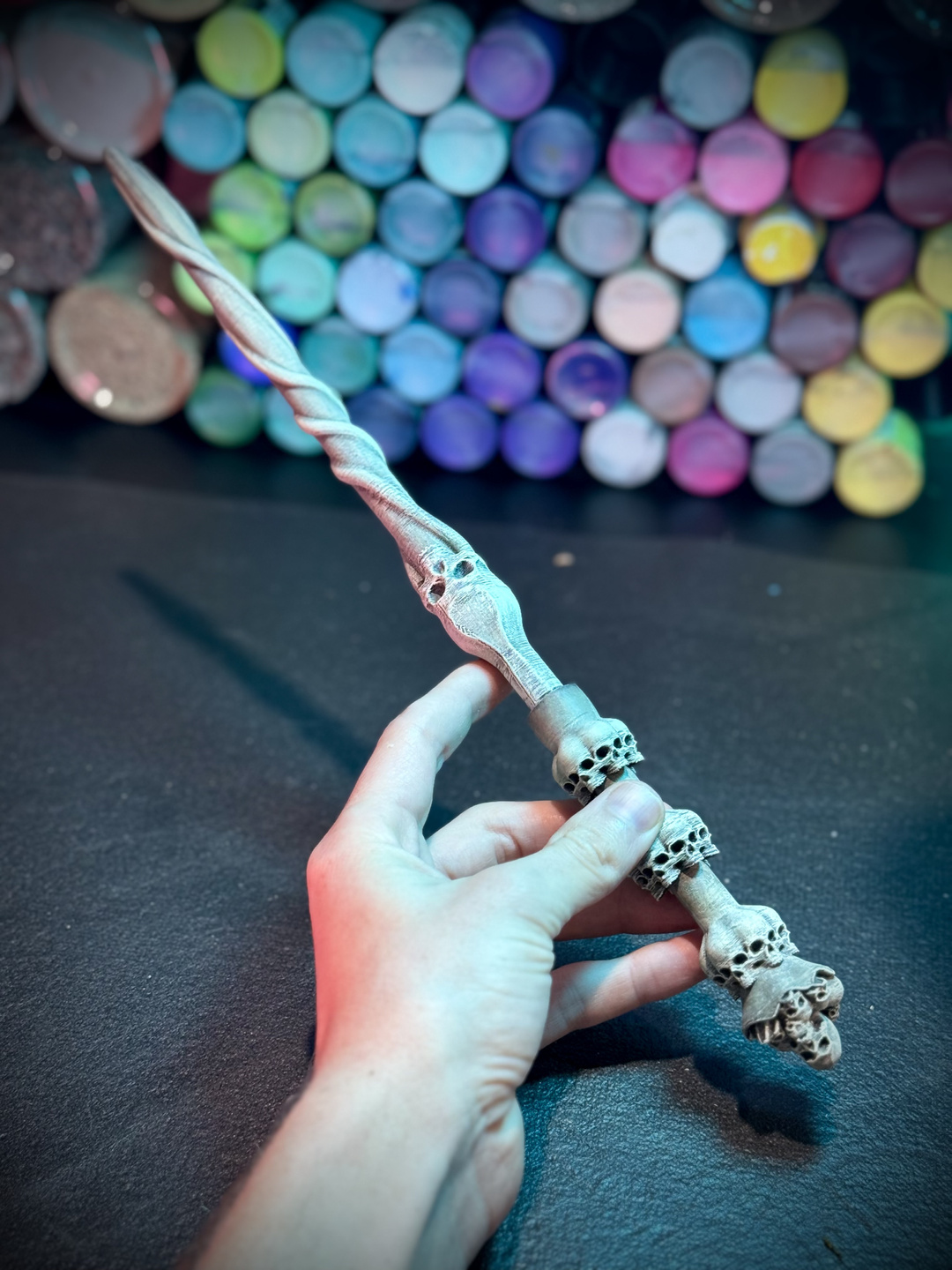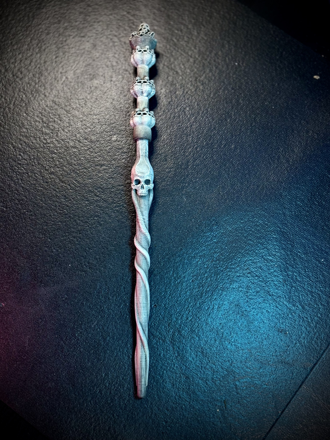 This wand is infused with the souls of those forgotten— those who vanished from memory yet linger in the shadows. It is from these souls that the wand draws its power, a conduit between life and oblivion. Every flicker of its magic is a whisper from the lost, a faint echo of lives once lived. Or so the story goes anyways.